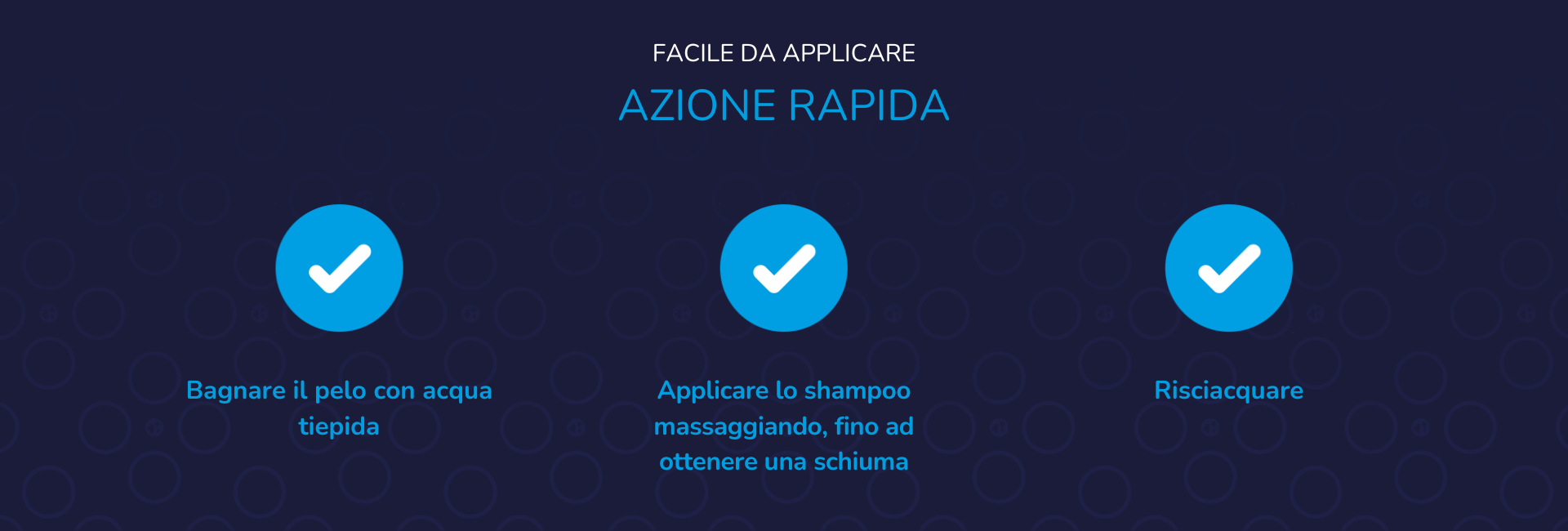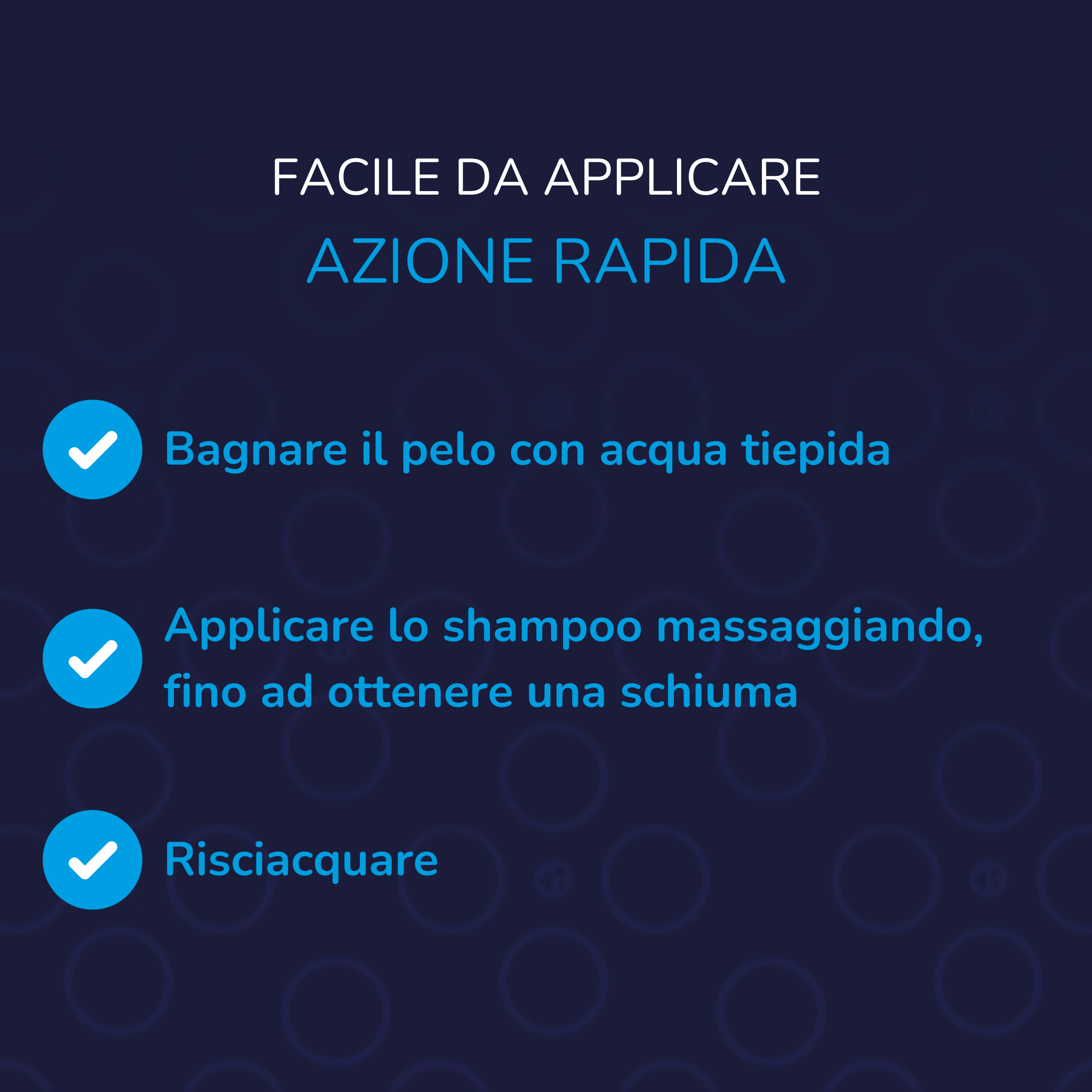Applicare il prodotto diluito (da 1 a 2 cucchiai da cucina per ogni mezzo litro d’acqua) sul pelo bagnato, massaggiando con cura fino ad ottenere una schiuma morbida e fine, e permettendo al prodotto di raggiungere la cute. Lasciare in posa alcuni minuti. Risciacquare accuratamente. In caso di manti molto sporchi, ripetere l’applicazione. Nel caso si utilizzi un phon nella fase di asciugatura, è consigliabile impostare una temperatura bassa.