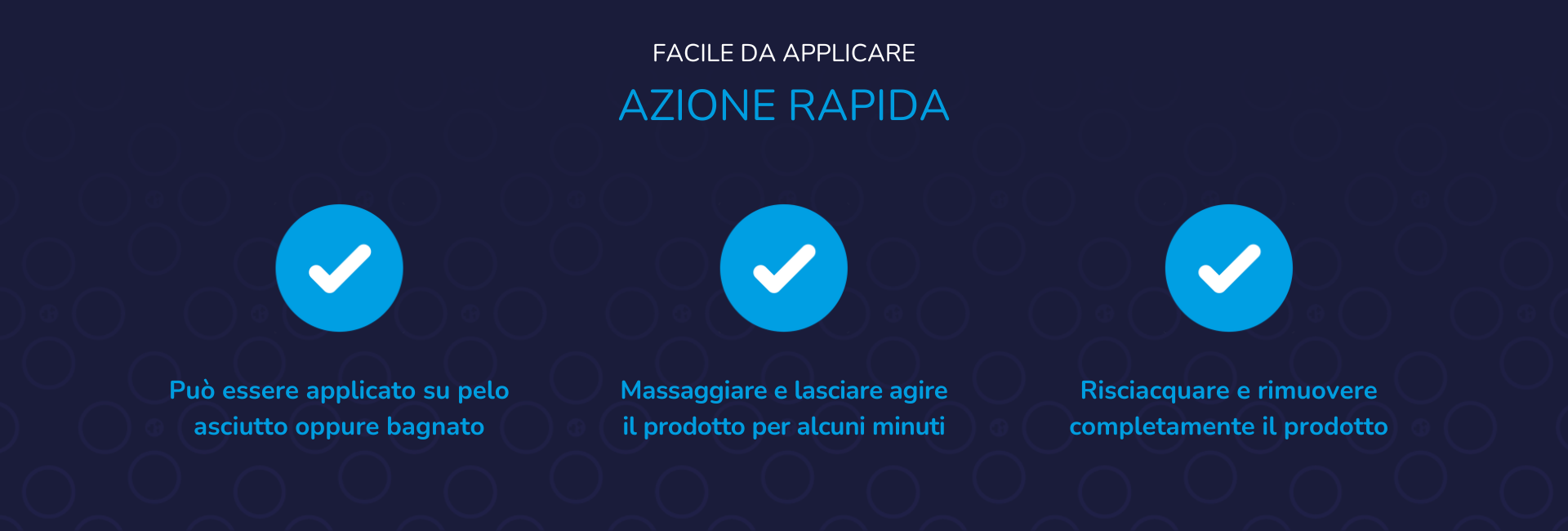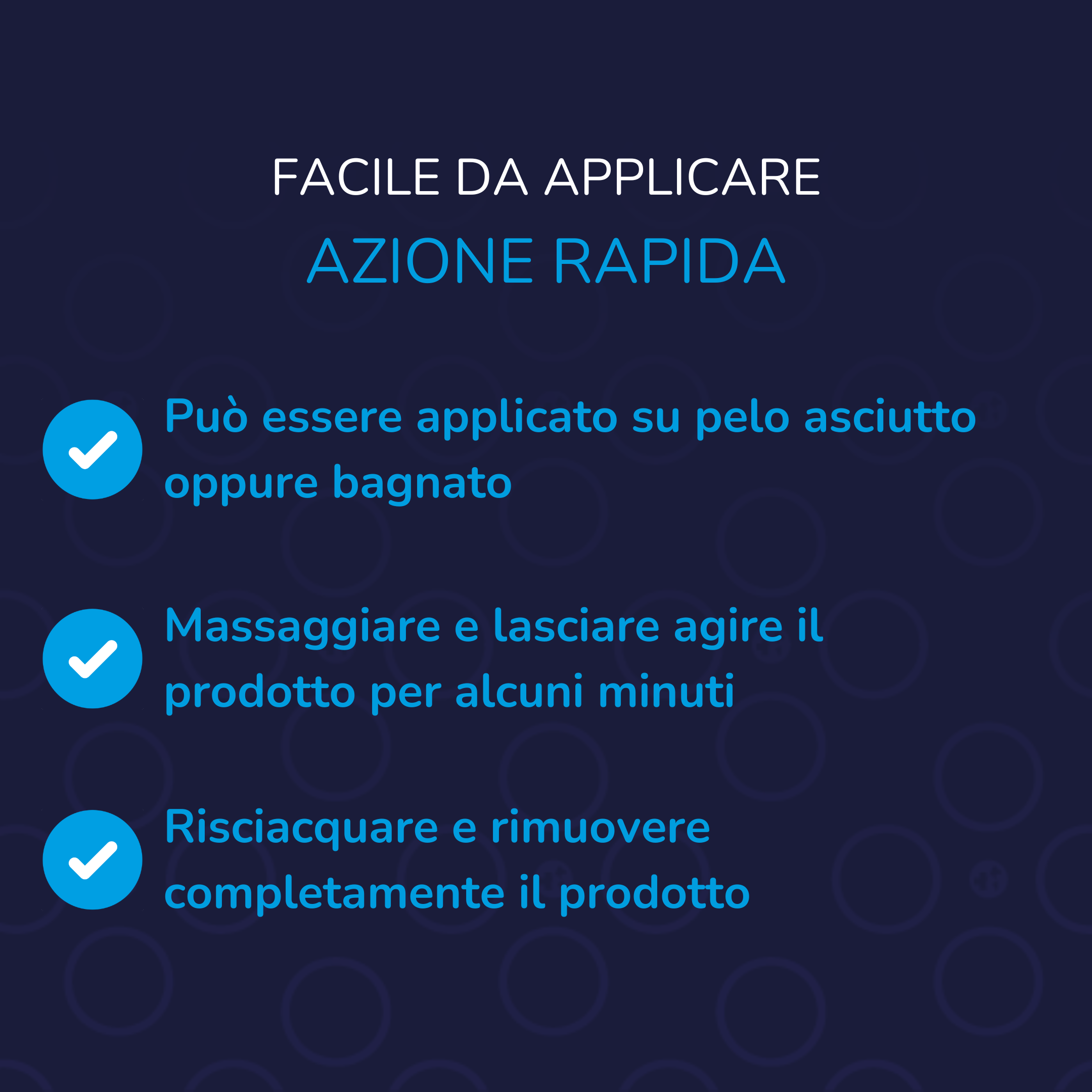 Applicare il prodotto diluito (da 1 a 2 cucchiai da cucina per ogni mezzo litro d’acqua) sul pelo bagnato, massaggiando con cura fino ad ottenere una schiuma morbida e fine. Lasciare in posa alcuni minuti. Risciacquare accuratamente. In caso di manti molto sporchi, ripetere l’applicazione. Non mescolare con altri sbiancanti.